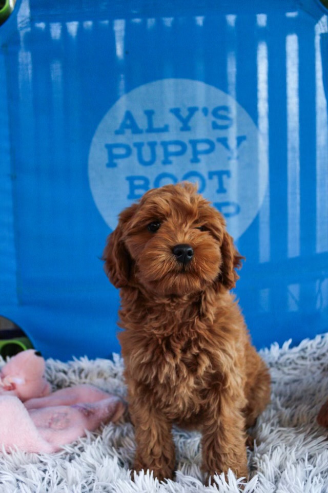 This apricot colored nugget is a multi-gen labradoodle doodle that has a soft, wavy fleece, non-shedding coat. She LOVES people, is completely engaged with humans and did I mention loves people! She is confident, athletic, fun, and can keep up with whatever you have planned, and yet she has this great chill mindset! She has a calm nature although totally fun too! There is no accident to WHY this lil’ girl is amazing…I’ve owned, trained and found doodle ambassador perfect match homes for many relatives that go all the way back to our legendary Lil’ Red’s, fabulous Mini’s that have been going strong for a decade: Lil’ Red Ryder, Lil’ Red Rosie, Lil’ Red Robyn, Lil’ Red Rudy, Lil’ Red Ruby, Lil’ Red Rocket, Lil’ Red Rocky, Lil’ Red Benny!! Poppa Harrison is the grandson from Loveable Labradoodle’s legendary stud Benjamin that begin it all! A true legendary stud that I have trained many of his progeny going all the way to grandchildren and great grandchildren, and great-great’s too. Every one of them has been AMAZING! Many are working service dogs and and therapy dogs. All are stellar in mindset and conformation. Momma Harlowe comes from lines of prolific momma’s that passes on her most fabulous traits.