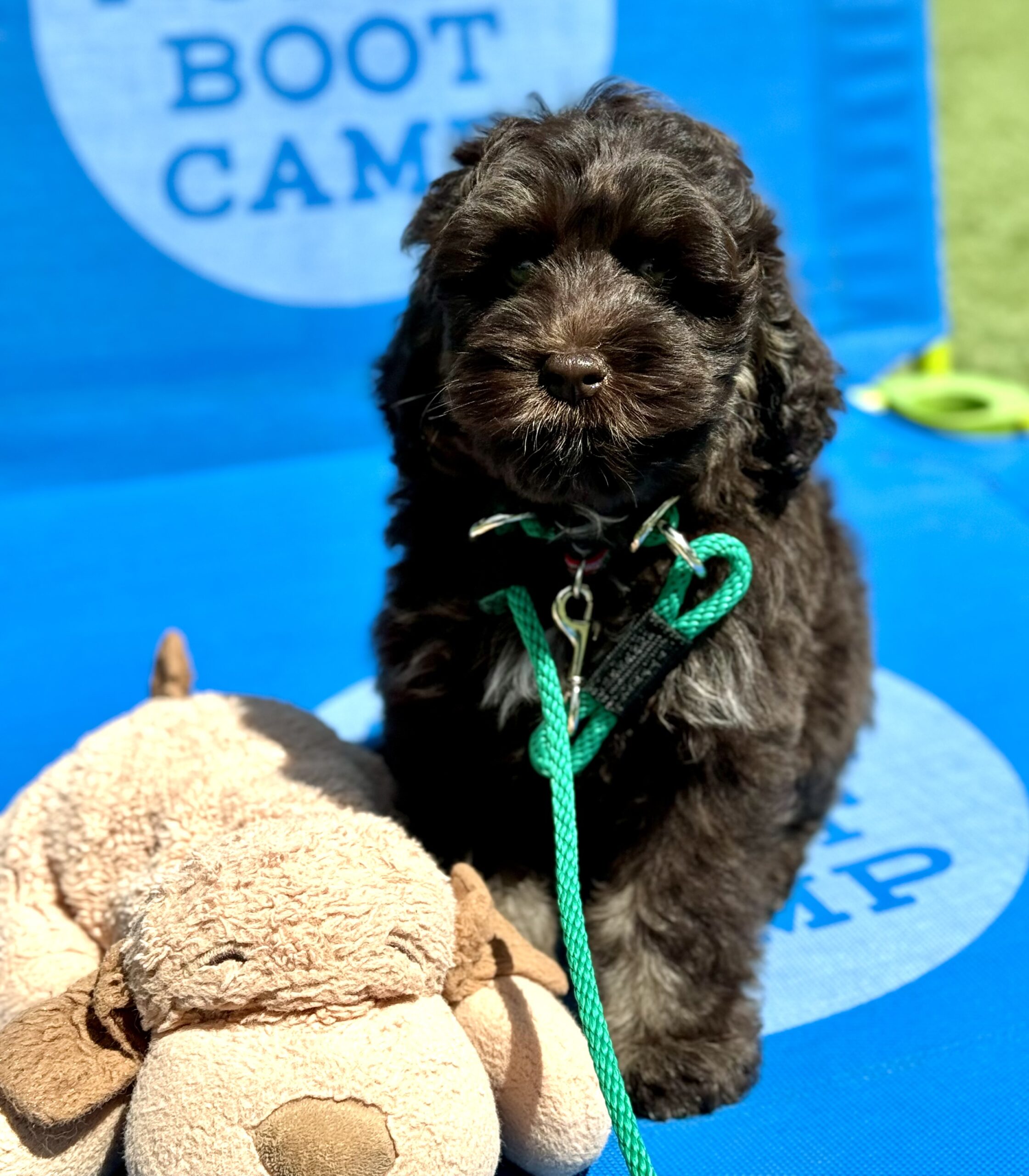 Introducing Jamie, our delightful chocolate nugget of love and an exceptional Doodle Ambassador. Jamie is a Mini Australian Labradoodle with a remarkable non-shedding coat, as soft as chenille, and stunning green eyes that gaze into your soul! He should be well under 20 lbs when full grown.