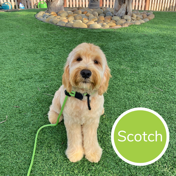Scotch the Goldendoodle : Born: 7/18/22 I love this adorable goldendoodle pup!!! This golden colored nugget is a small, multi-gen goldendoodle doodle that has a soft, wavy fleece, non-shedding coat. This stunning boy should be approx 30 – 40 lbs. when full grown. He LOVES people, engaged with humans and did I mention loves people! He is athletic, fun, and can keep up with whatever you have planned, and yet has this great chill mindset! There is no accident to WHY this guy is amazing…I’ve owned, trained and found perfect match homes for relatives: Kenny, Sadie, Mochi, Cici, Dudley Sweet Baby Lucas, Meadows, Ginger, and Riley too. Poppa- Tanner has an is amazing and comes from a fantastic dog named Charlie. I have trained so many of his progeny going all the way to grandchildren and great grandchildren, and every one of them has been AMAZING! Stellar in mindset and conformation. Momma Summer is from one of my favorite Goldendoodles, Finely, who I trained as a puppy and have had many of her pups through the years. She is a prolific momma that passes on her most fabulous traits. They both come from the amazing breeding programs of Gail’s Doodles who were my very first clients when I began my business. My personal dog Kozi came from them too. Both parents have amazing temperaments & great health and lines from some of my prior elite doodle ambassadors! I love it when the generations gather at APBC and I can’t wait to see who he will grow up to be. I love his curiosity, eye contact, his willingness to explore and LOVES snuggles. There is every indication that he will be as stunning and amazing as his lineage. My Doodle Ambassadors are special; my son Luke and I personally temperament test these pups and only allow the BEST into my Ambassador program. The unique thing is: This is a pup that I would want to be my own! My Ambassadors are trained by me for approximately 6 months before they go to their PERFECTMATCH™ homes and it can be arranged for an APBC team member to bring your pup directly to you! These pups are truly the BEST of the BEST. Best breeding + Best foundation training + the PERFECTMATCH™ chosen humans=BEST DOG EVER! They will be neutered & spayed before they leave, we have their health records since birth, micro-chipped and current on all vaccinations. If you want a devoted companion to go do everything with, this is your boy!